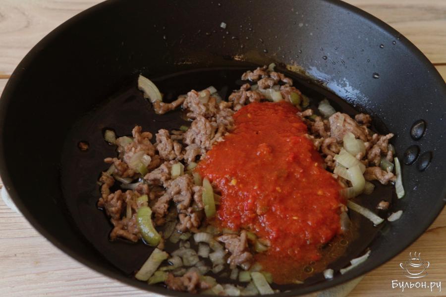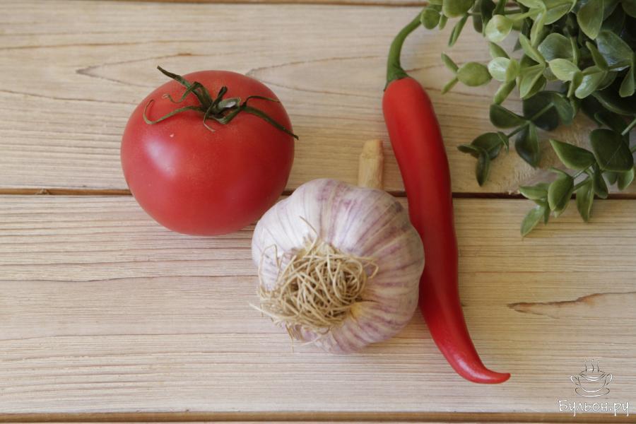 5. Помидор ошпарить, снять кожуру, перец нарезать на дольки, чеснок почистить. Пробить все блендером и добавить к мясу. Потушить пару минут.