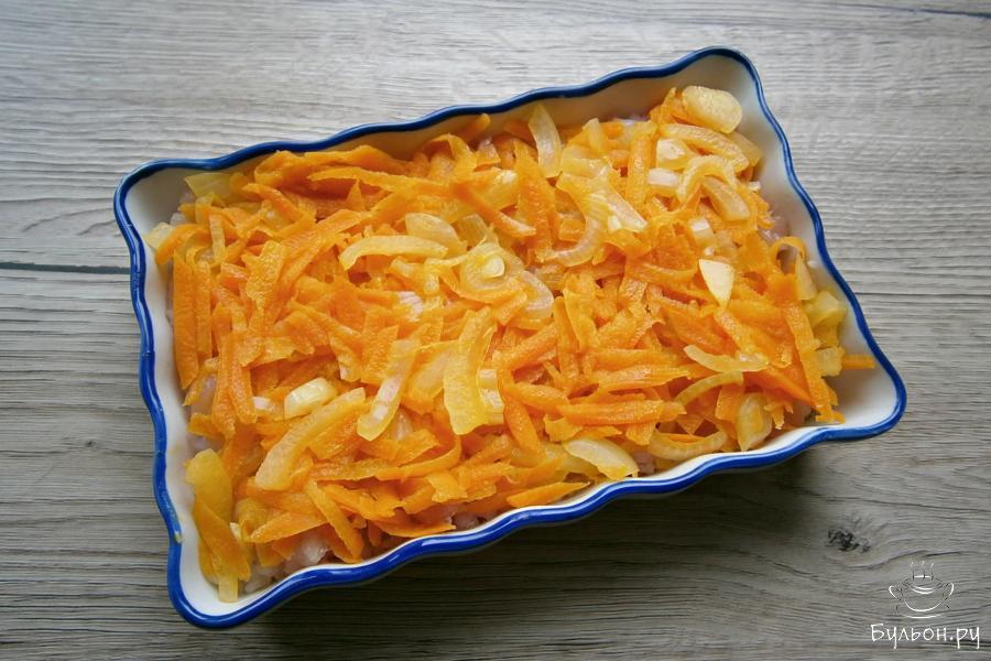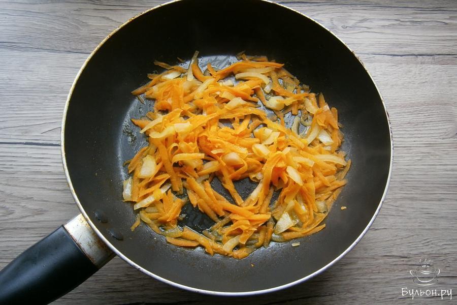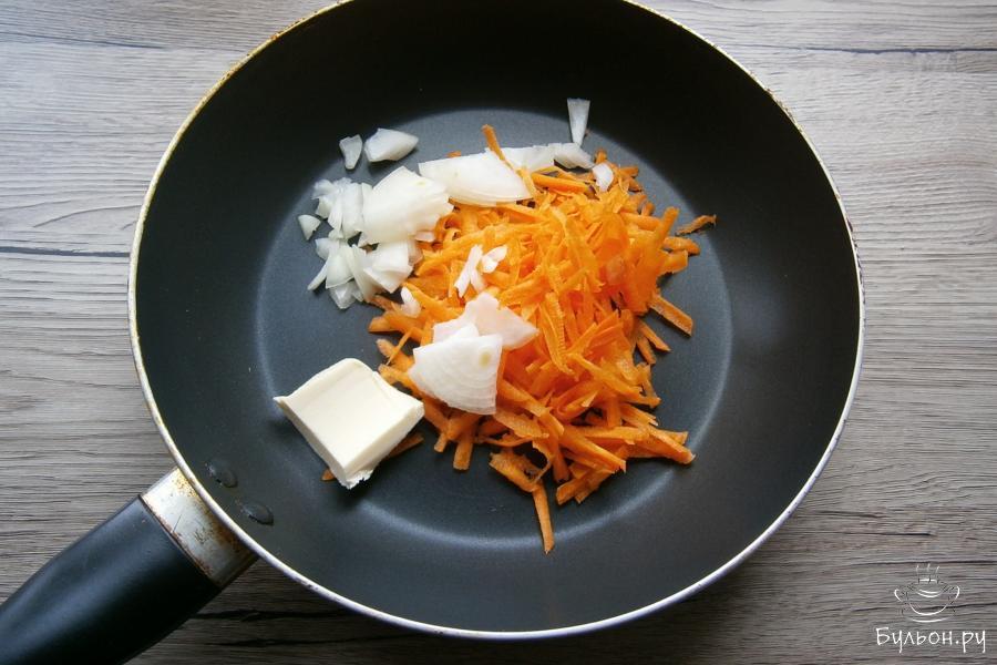 4. Лук порезать небольшими кусочками, морковку натереть, поместить овощи в сковороду с оставшимся сливочным маслом.