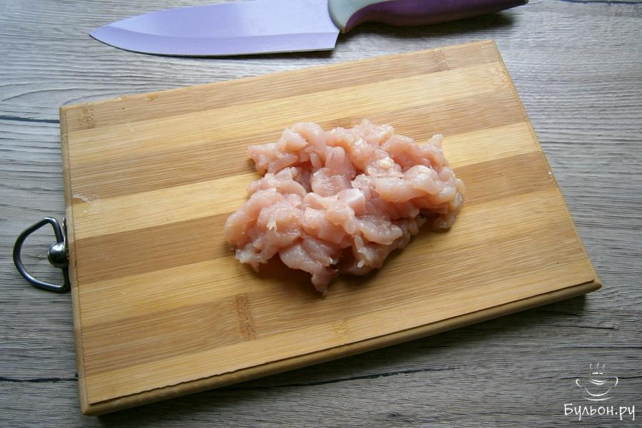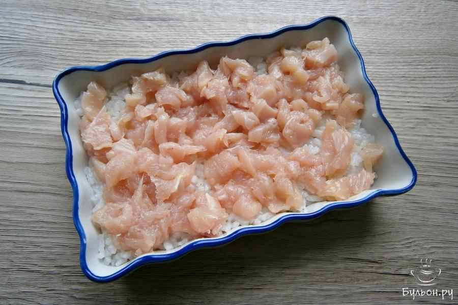 3. В небольшую, смазанную чуть сливочным маслом форму, выложить рис, сверху выложить куриное филе, чуточку посолить. У меня форма - 12 х 18 см.