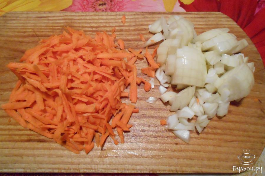 7. Добавить в сковороду морковь и лук. Перемешать и жарить на среднем огне до мягкости моркови, подлив немного растительного масла.