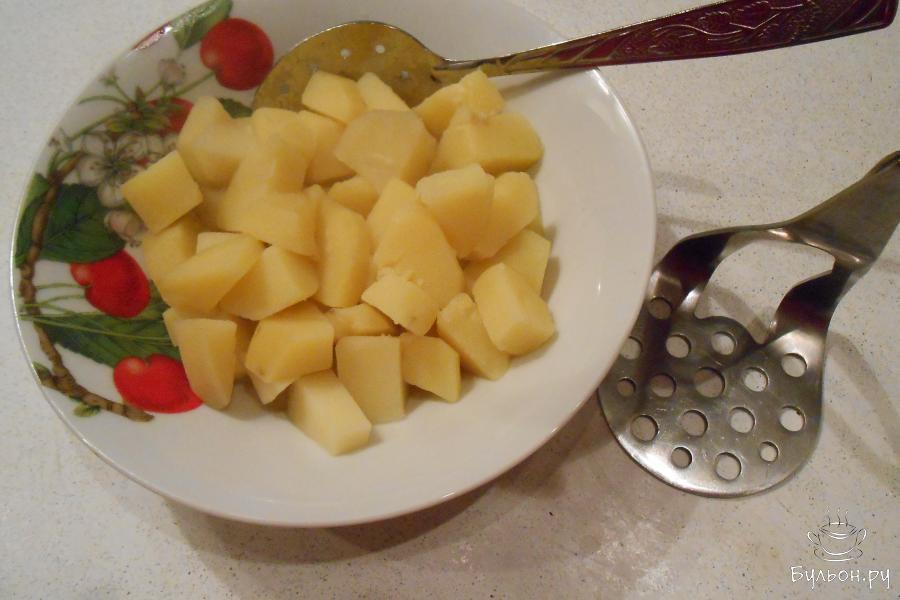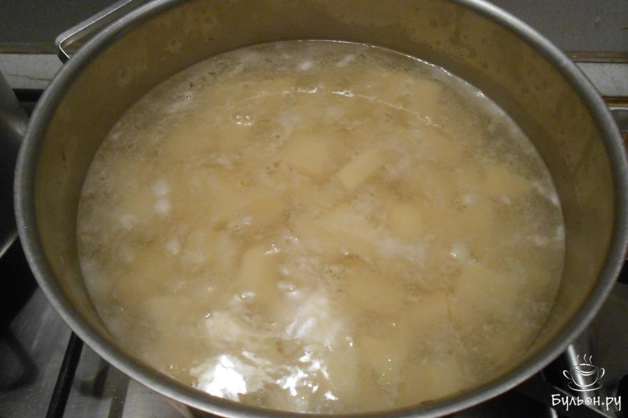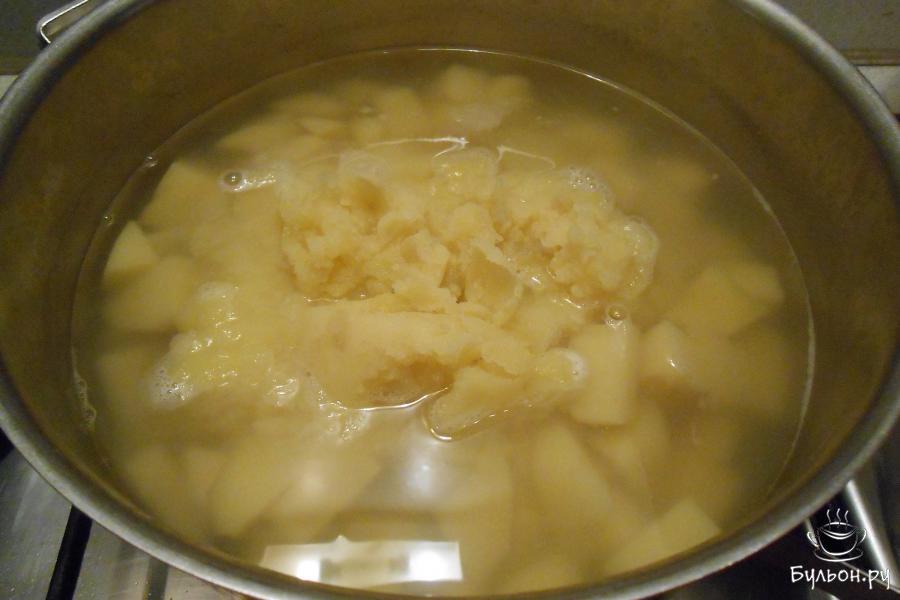 12. Добавить в кастрюлю к картофелю мясную заправку и перемешать. Варить на медленном огне 10 минут, не накрывая крышкой.
