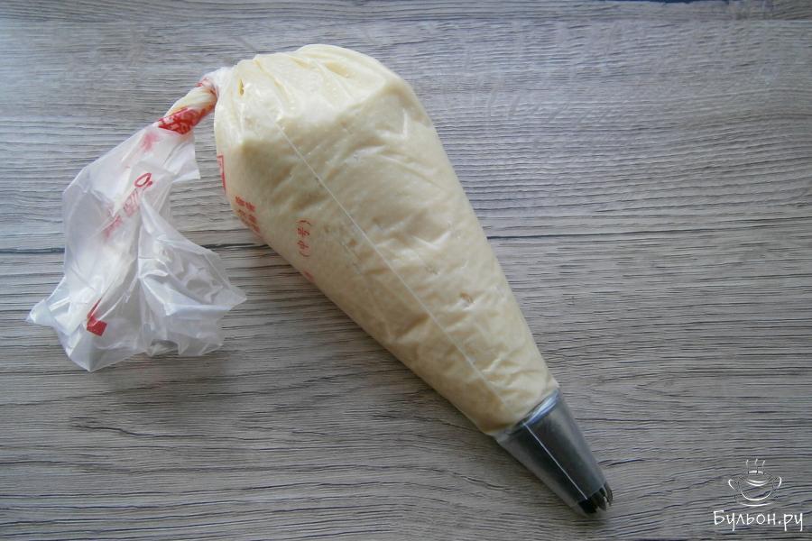 6. Противень выстелить пергаментом, отсадить тесто в виде маленьких печенюшек. В середине сделать небольшую выемку и наполнить ее любым джемом.