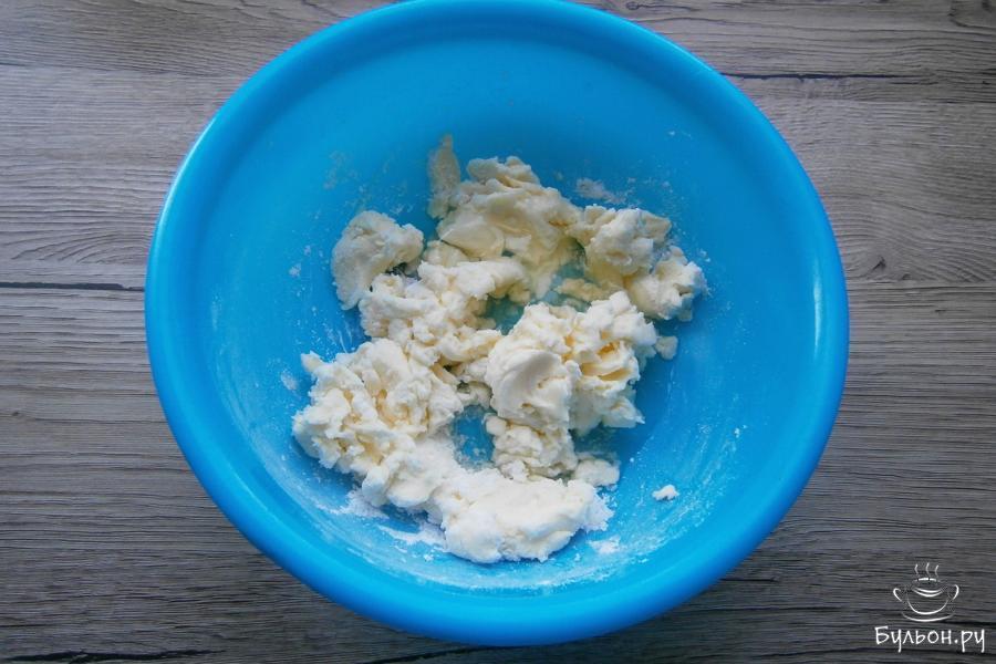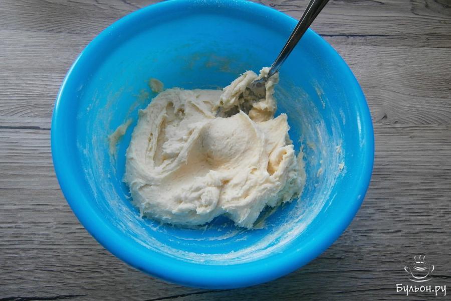2. Хорошо все растереть. Яйцо разделить на желток и белок. В массу добавить только белок, желток использовать в другом блюде. Миксером взбить все вместе до однородности.