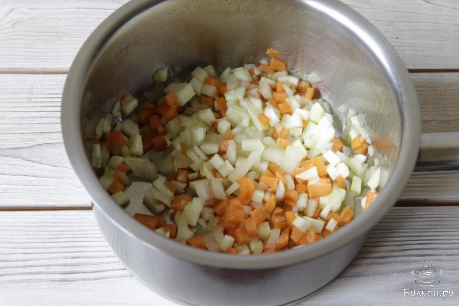 2. Зубчик чеснока почистить и обжарить целиком в течение 1-2 минут на оливковом или растительном масле. Чеснок достать и выбросить. Здесь он нам больше нужен для аромата.