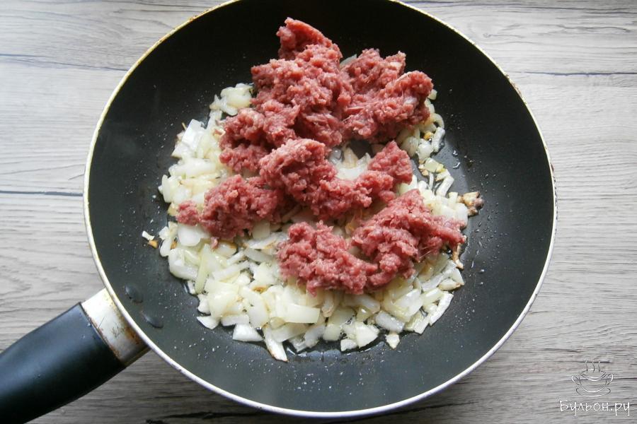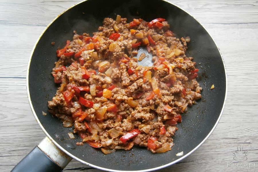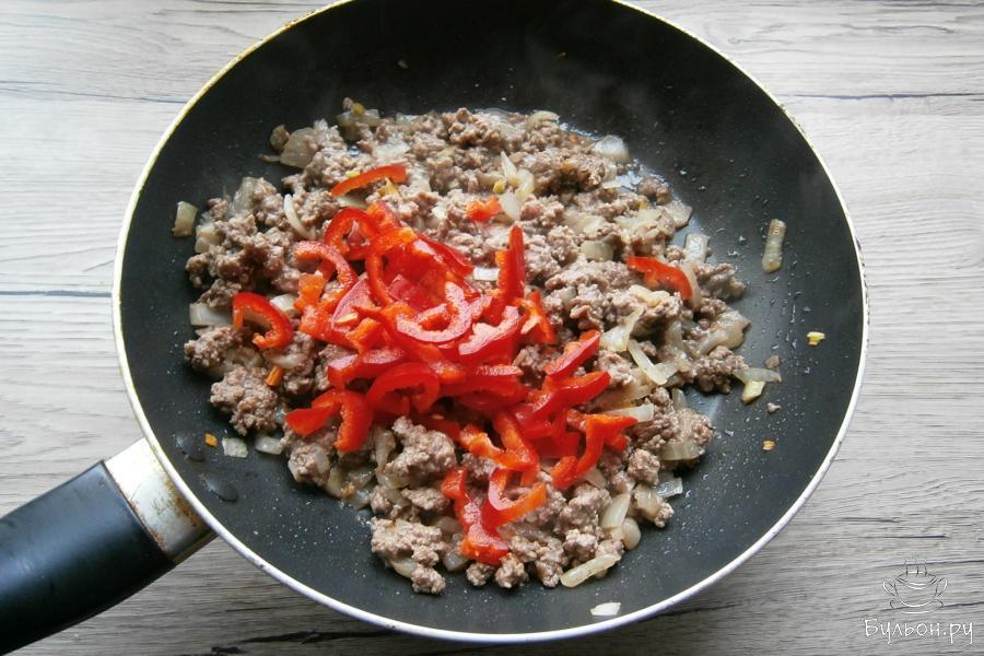 10. Все перемешать и обжаривать фарш с луком минут 5-6. Далее, добавить в сковороду порезанный соломкой болгарский перец, обжаривать все вместе еще минут 6.