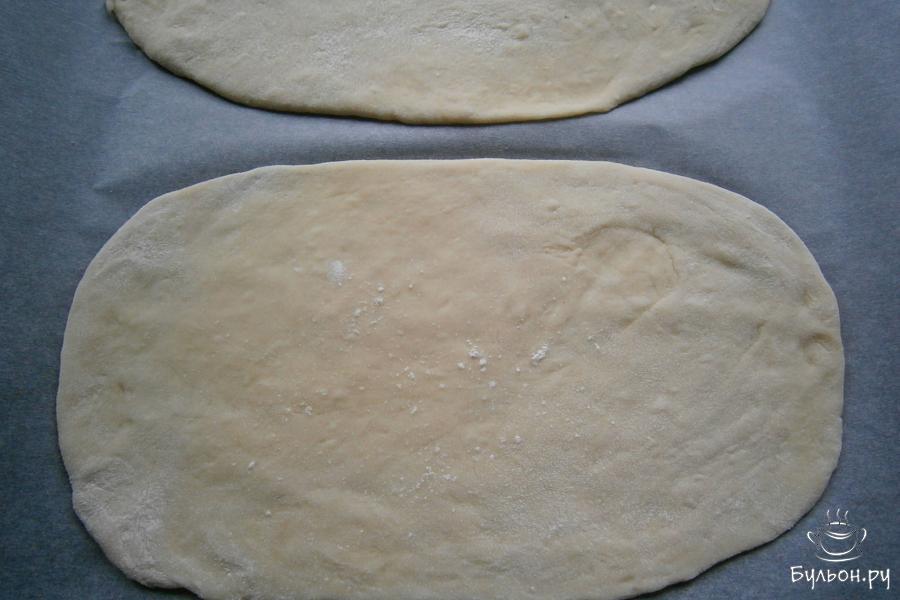 14. Каждую часть теста раскатать в тонкую овальную лепешку, которую выложить на противень, покрытый пергаментом.