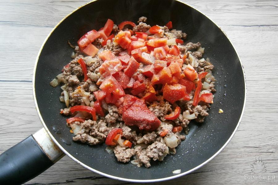 11. Добавить ложку томатной пасты, порезанный кубиками свежий помидор, все посолить, посыпать приправой или специями, а также, молотым перцем чили по вкусу, влить немного горячей воды, перемешать.