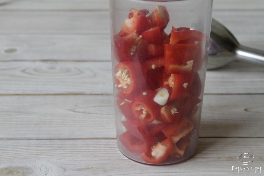 1. Подготовить все ингредиенты по списку: острый перец чили, сладкий красный болгарский перец и один зубчик чеснока.