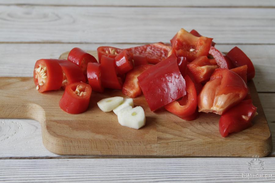 2. Болгарский перец очистить от семян и перегородок, порезать, перец чили нарезать на шайбы, а зубчик чеснока почистить и разрезать пополам.