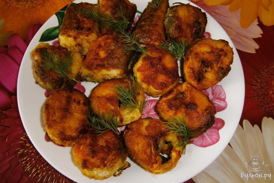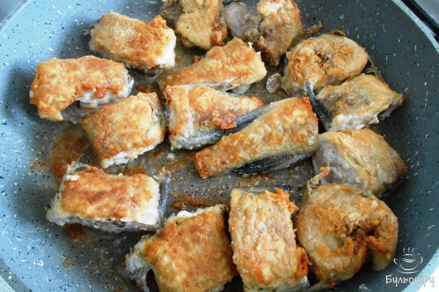 4. Обжарить кусочки минтая на небольшом огне на сковородке с маслом до золотистой корочки. В течение 7 минут с одной стороны.