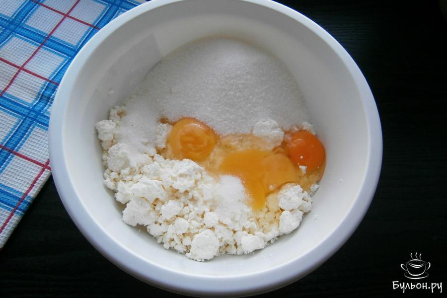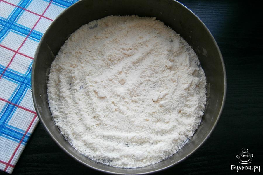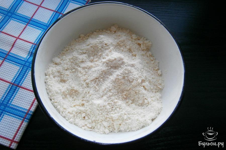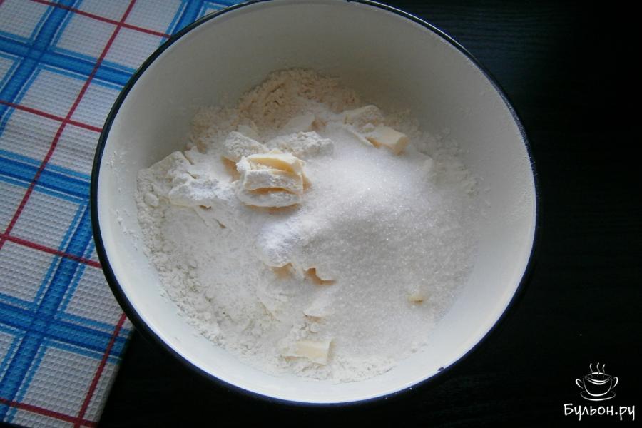 1. В муку пшеничную высшего сорта добавить порезанное холодное масло, всыпать 1/2 стак. сахара, а также, 10 г разрыхлителя.
