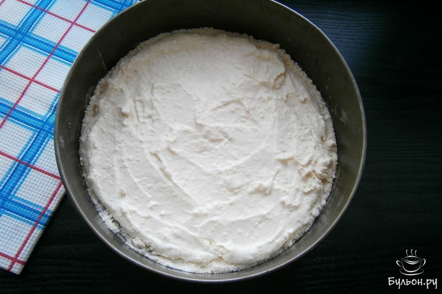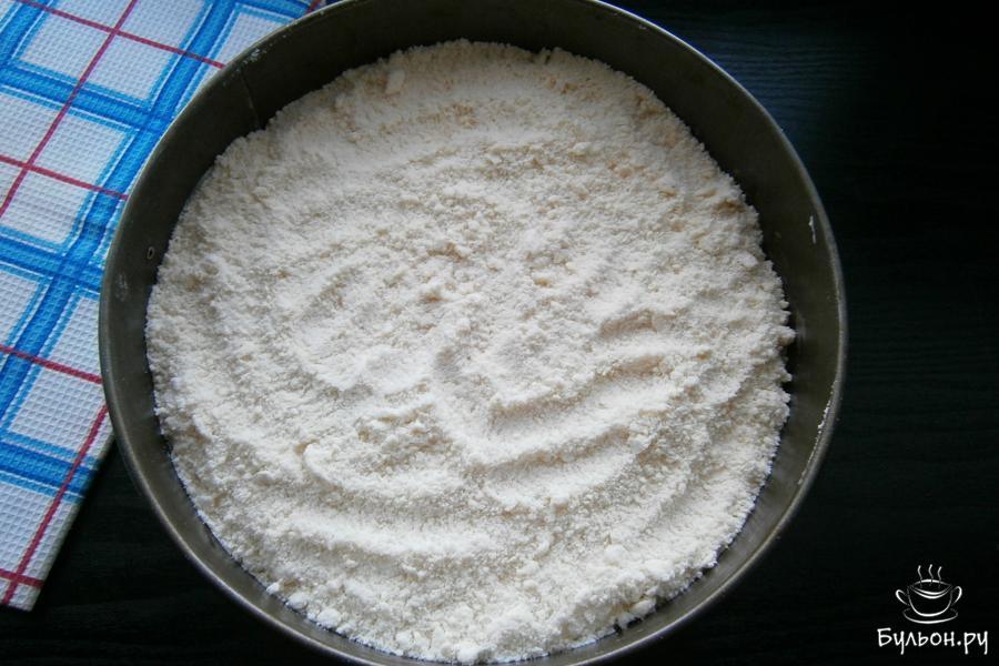 5. Дно разъемной формы диаметром не менее 24 см застелить пергаментом. Всыпать третью часть сухой крошки, разровнять.
