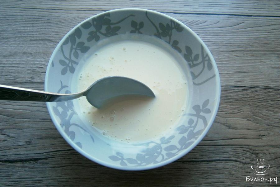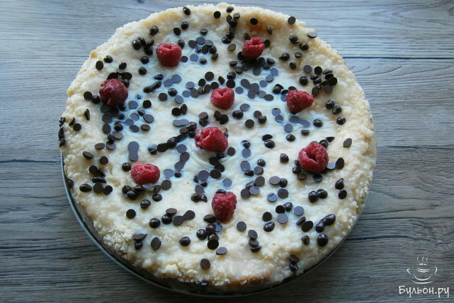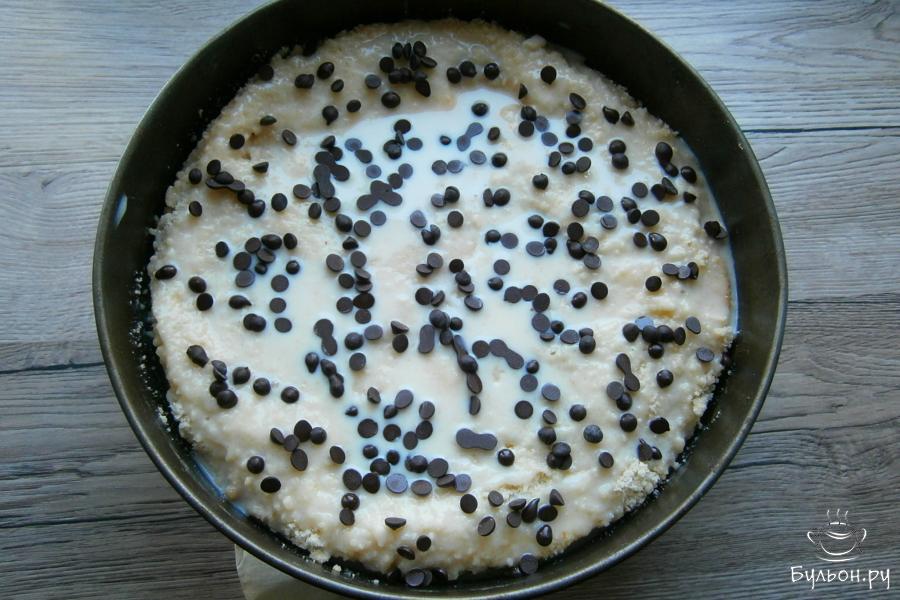 9. Готовую, горячую ватрушку залить смесью из сгущенки и сметаны прямо в форме и сверху посыпать тертым шоколадом. У меня были шоколадные капли.