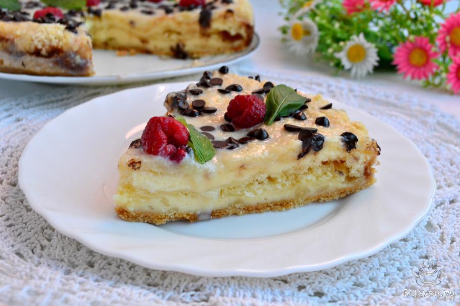 7. Затем, снова часть крошки и всю творожную массу. Сверху засыпать оставшейся сухой крошкой, разровнять. Отправить ватрушку в духовку, печь при 180 град. около часа.