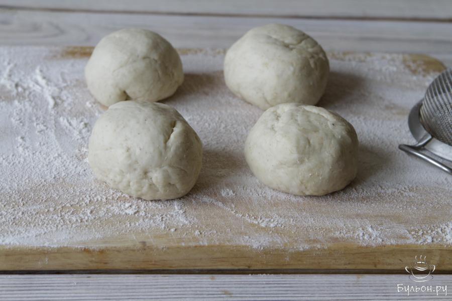 7. Тесто разделить на равное количество и сформировать небольшие шарики. Оставить их на расстойку на 20-30 минут. Включить духовку и разогреть ее вместе с камнем для выпечки при температуре 220 градусах.