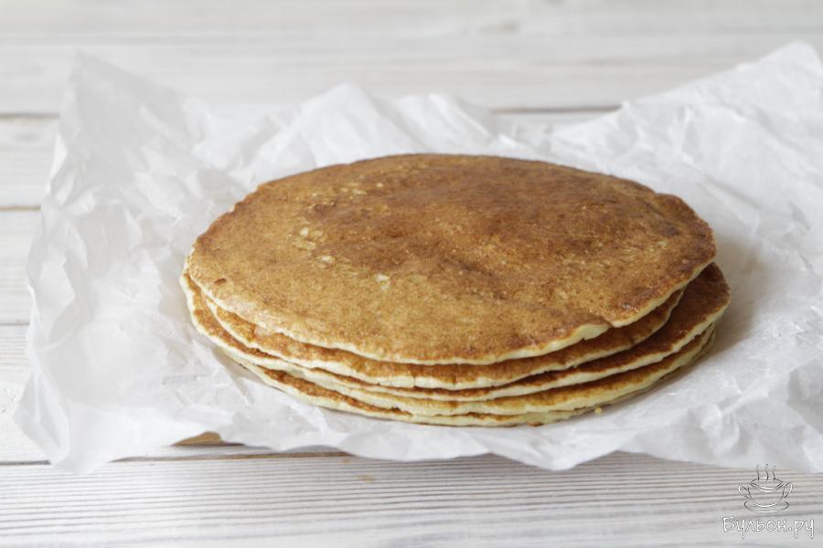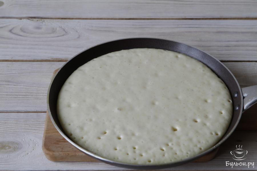 8. Примерно через 2 часа можно выпекать блины. Разогреть сковороду. Тесто влить на сухую сковороду, выпекать блины с двух сторон по 2-3 минуты.