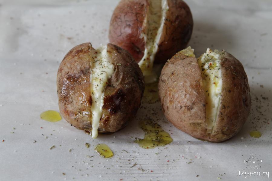 7. Перед подачей сбрызнуть слегка оливковым маслом и приправить травами. Вкусный печеный картофель с плавленным сыром готов. Подавать сразу. Приятного Вам аппетита.