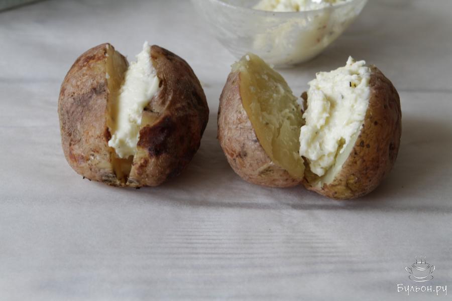 5. По истечении указанного времени достать картофель из духовки. Аккуратно снять фольгу и разрезать картофель пополам.