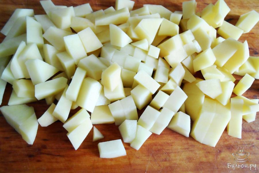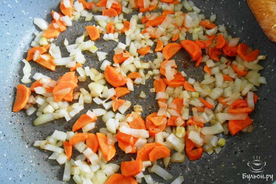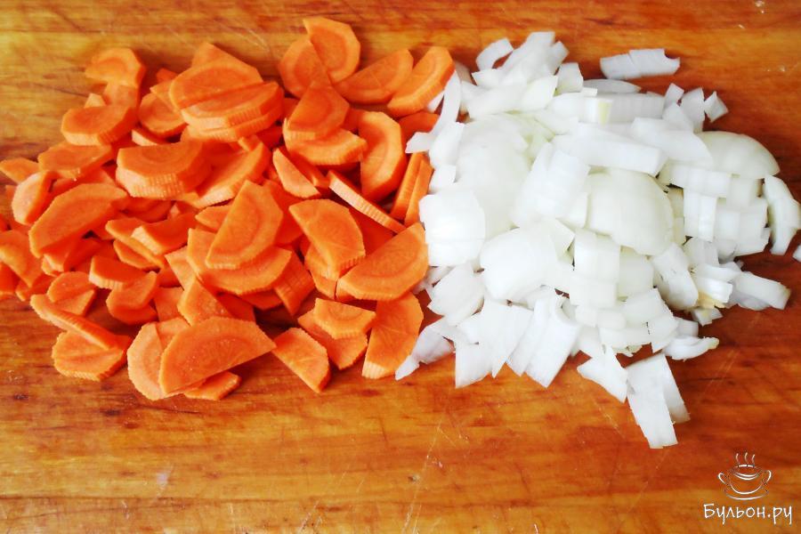 6. Морковку и луковицу очистим от кожуры и промываем. Морковку нарезаем полукружочками, луковицу нарезаем мелким кубиком.