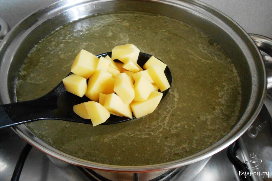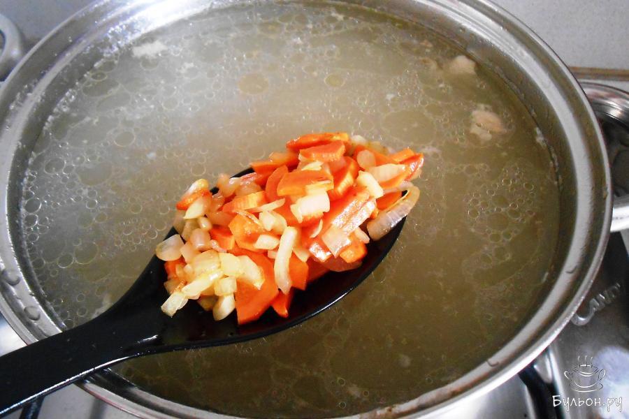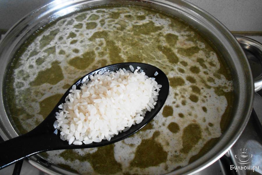 5. Сразу добавляем промытый рис, перемешиваем и снова доводим до кипения. Необходимо снять пенку и варим еще 15-20 минут.
