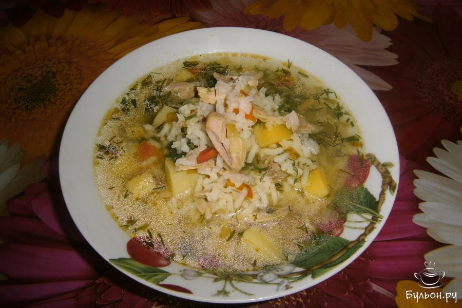 Рисовый суп с поджаркой и курицей - это диетическое блюдо. Предлагаю приготовить легкий и очень вкусный обед. Аппетитный суп с рисом получается ароматным с золотистым бульоном. Бульон можно варить на куриных ножках, куриной грудки или куриных крылышках, а я выбрала куриную спинку, чтобы бульон был более наваристым. Кстати, укроп можно заменить петрушкой, что никак не повлияет на вкус готового блюда. Подавать рекомендую в горячем виде с ломтиками белого или черного хлеба.