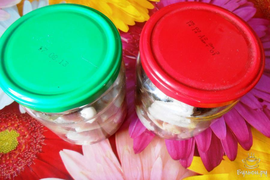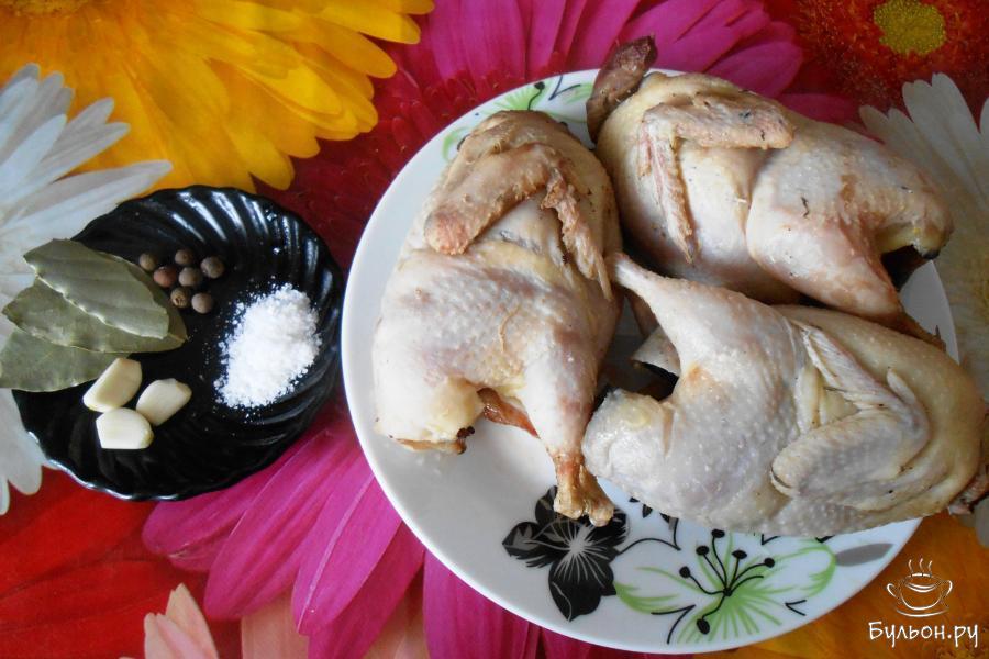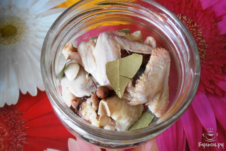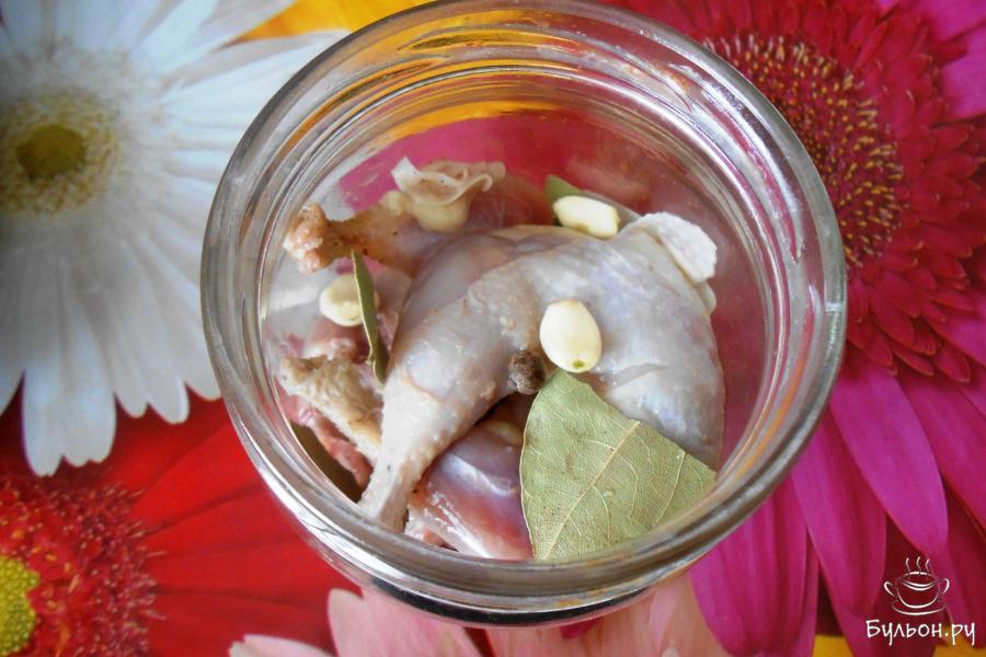 4. Уложить на дно банки грудку перепелов, лавровый лист, зубчик чеснока, пару горошин черного перца.