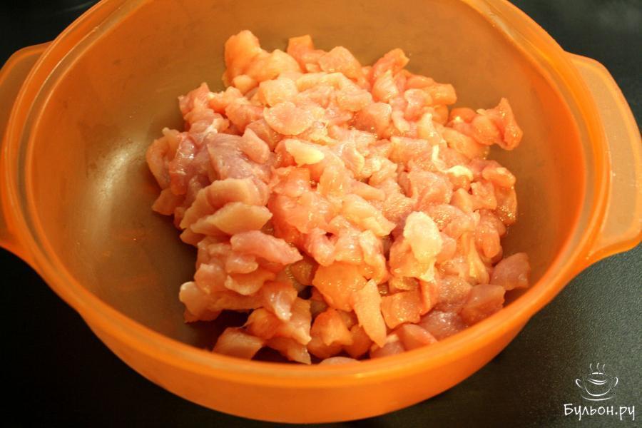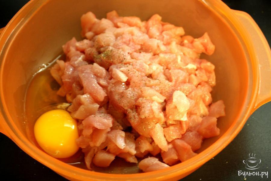 1. Филе индейки промыть, мелко порубить ножом. Кусочки не должны быть очень мелкими, должна чувствоваться текстура