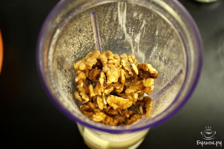 3. В блендере перемолоть грецкие орехи с добавлением панировочных сухарей и крупной соли, чтоб смесь не превратилась в кашицу