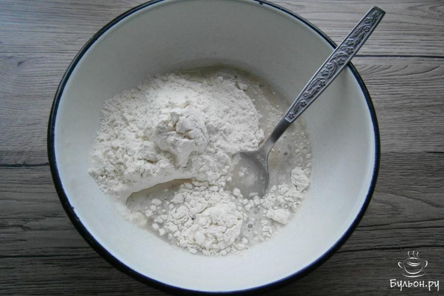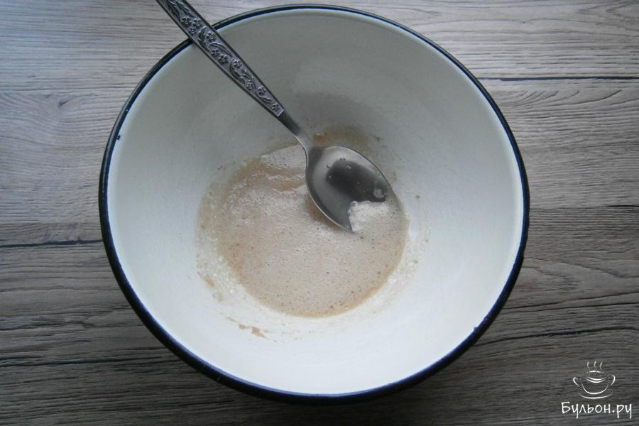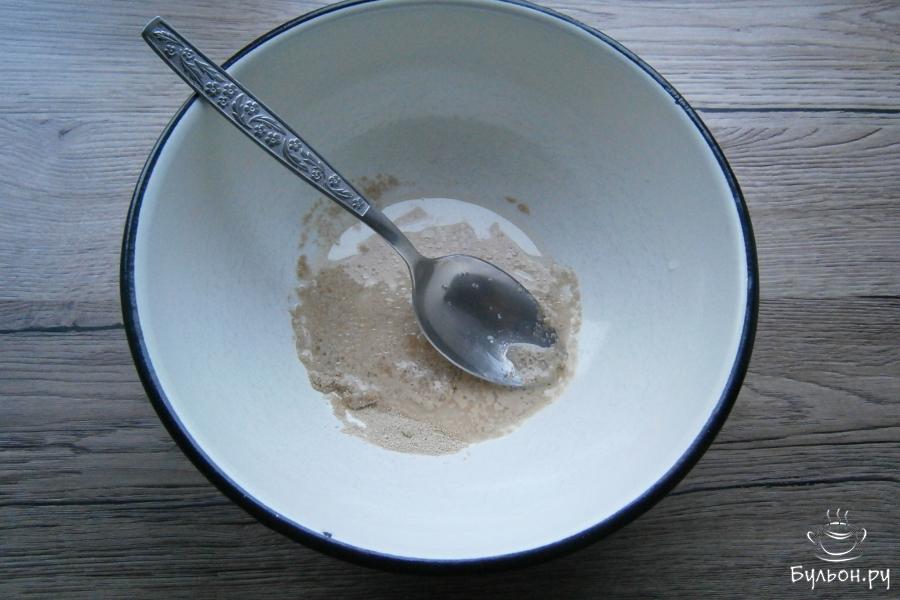 2. Влить 2 ст. ложки тепленькой воды от общего количества, все перемешать, прикрыть полотенцем или пленкой и оставить на 10-15 мин.