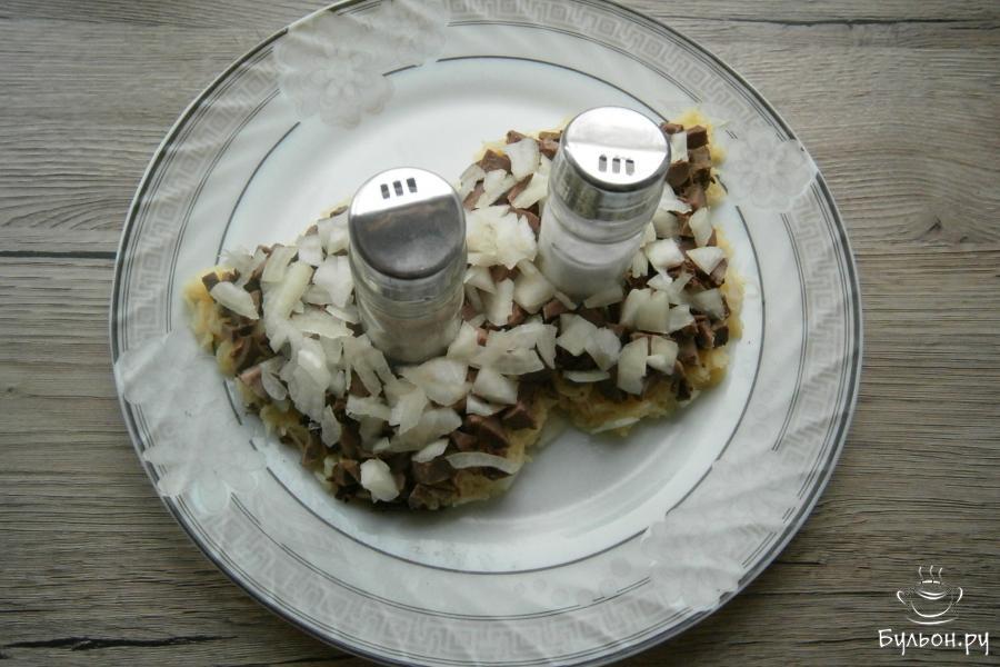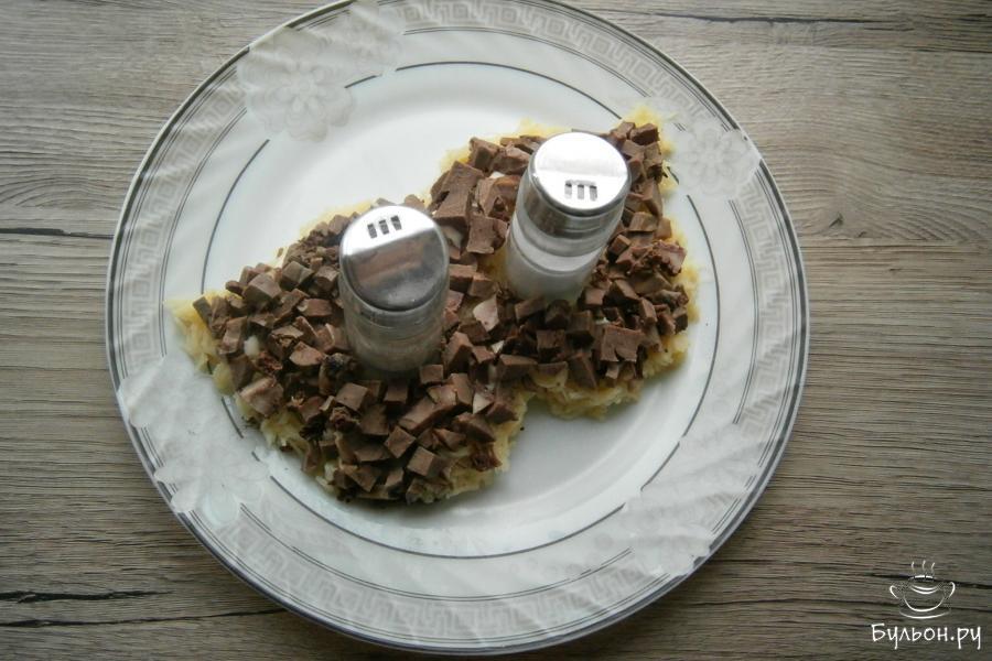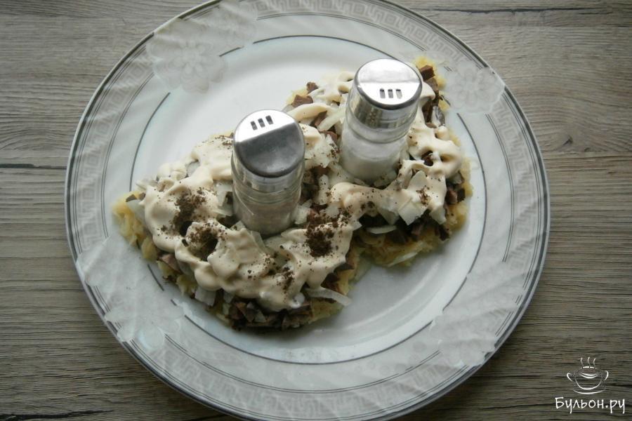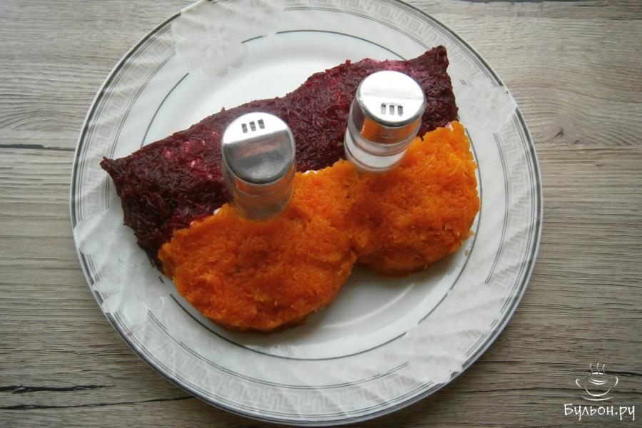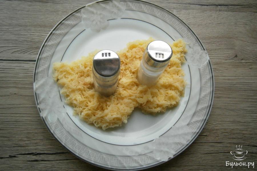 2. Картофель натереть, желательно, на мелкой или средней терке. На тарелку выложить картофель в форме карнавальной маски. Чтобы получились отверстия для глаз, которые есть в карнавальной маске, можно воспользоваться солонкой и перечницей.