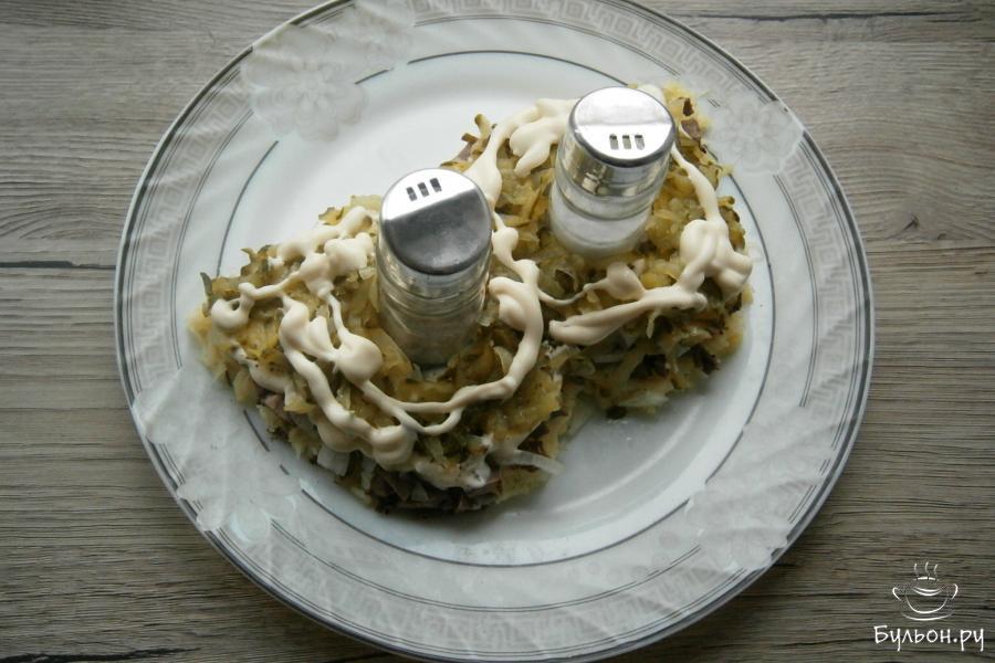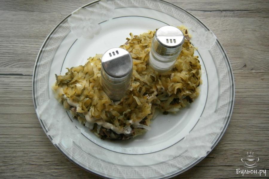 6. Следующим слоем в данном салате, выложить маринованный огурец, натертый на терке, а затем, отжатый от жидкости.