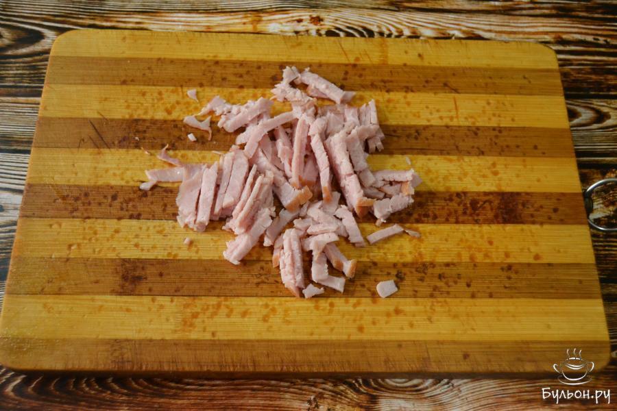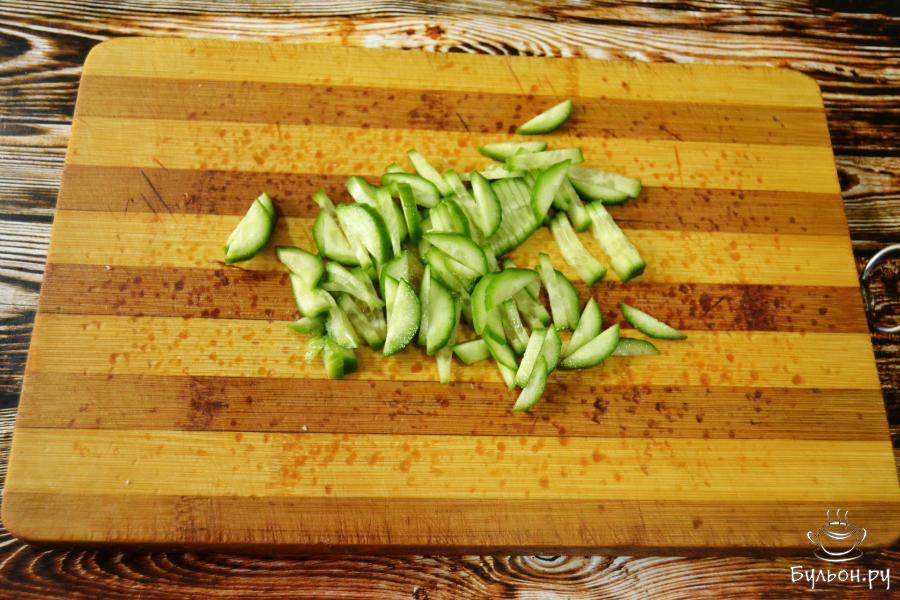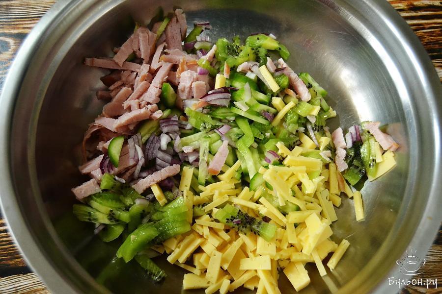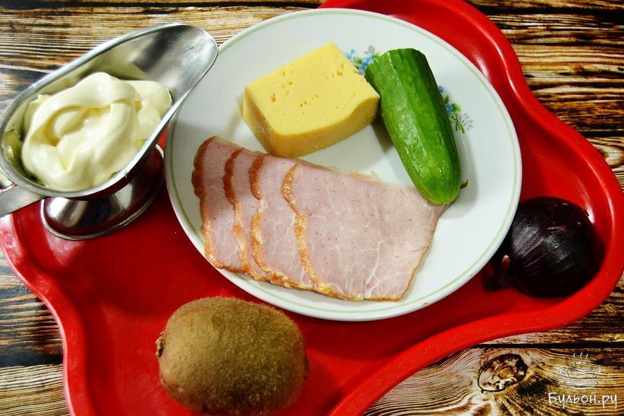 1. Подготовим ингредиенты. Киви нам подойдет и сладкое и не очень. Ветчину можно заменить колбасой. Если огурец длинный тепличный, то его нам понадобится половина. Ну а если огурчик маленький, то используем целый.