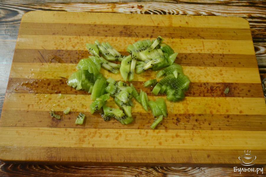 Салат с киви можно приготовить и в будни и на праздник. Готовится салат настолько быстро и просто, что даже при загруженном рабочем дне можно выделить несколько минут, чтобы приготовить это блюдо. Дело в том, что ингредиенты для салата не требуют предварительной подготовки. Их не нужно чистить (за исключение киви), отваривать, обжаривать, мариновать, перебирать. Нам всего лишь нужно нарезать все ингредиенты тонкими продолговатыми дольками.