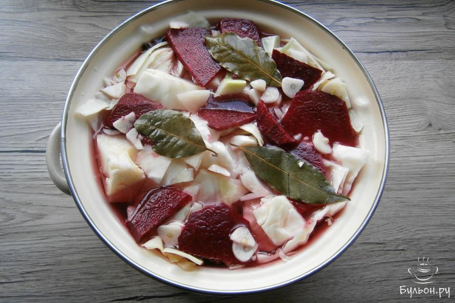 5. Залить капусту со свеклой горячим маринадом. Если готовите в кастрюле, можно сверху поставить небольшой гнет. Оставить капусту при комнатной температуре минимум на 8 часов.