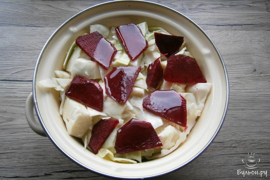 1. В кастрюлю или банку поместить часть порезанной "шашечками" или просто небольшими кусочками капусты. Свеклу порезать тонкими полукружочками и часть ее выложить на капусту.