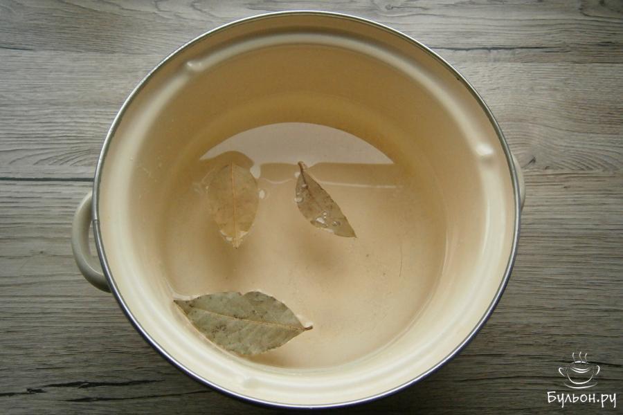 4. В отдельную кастрюлю влить литр воды, добавить крупную каменную соль, лавровый листик, всыпать половину стакана сахарного песка. Все довести до кипения, прокипятить минут пять. После этого, влить столовый девятипроцентный уксус, выключить газ.