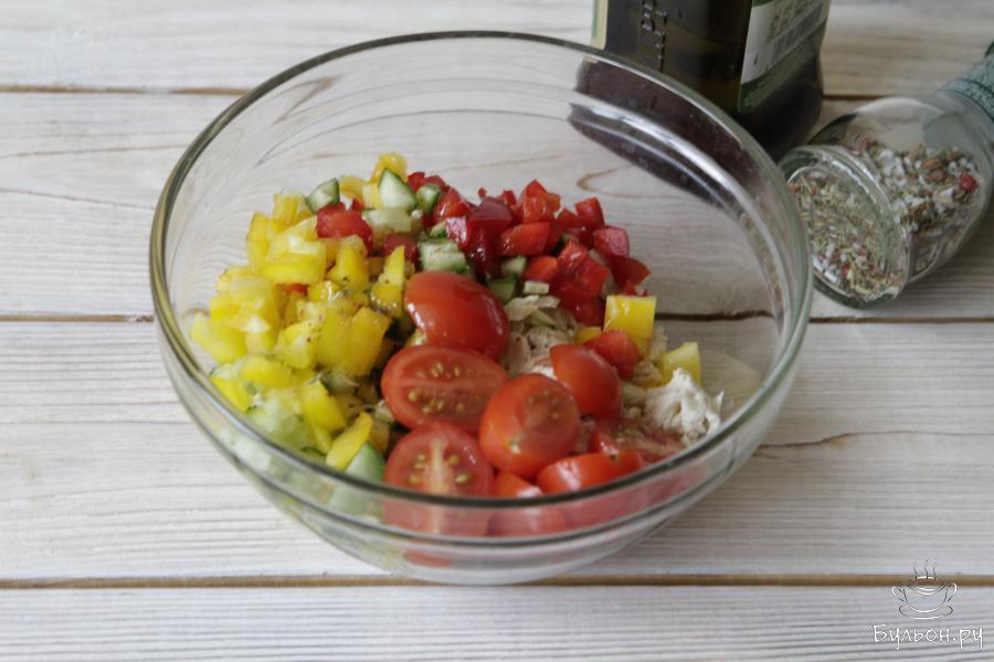 2. Болгарский перец можно взять двух цветов (тогда по половинке) помыть, очистить от семян и нарезать на небольшие квадратики, так же как и свежий огурец.