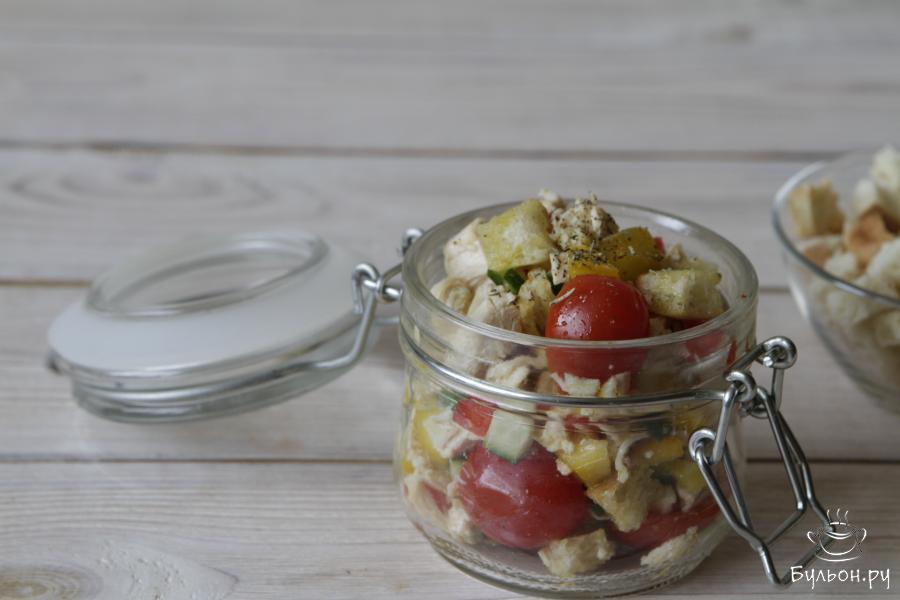 Салат Сухарничек пожалуй мало чем отличается от знаменитого салата "Цезарь" и относится он к рецептам украинской кухни. Вариаций приготовления этого салата огромное множество. Предлагаемый рецепт салата по праву можно отнести к категории диетических блюд, так как заправляется салат не майонезом и сметаной, а оливковым маслом. Куриная грудка предварительно отваривается в слегка подсоленной воде, а не обжаривается. А сухарики добавляются совсем чуть-чуть, для вкуса и для тех, кто любит похрустеть. Предлагаю приготовить и попробовать этот простой, но очень вкусный салат из курицы, помидор, свежего огурца и болгарского перца.