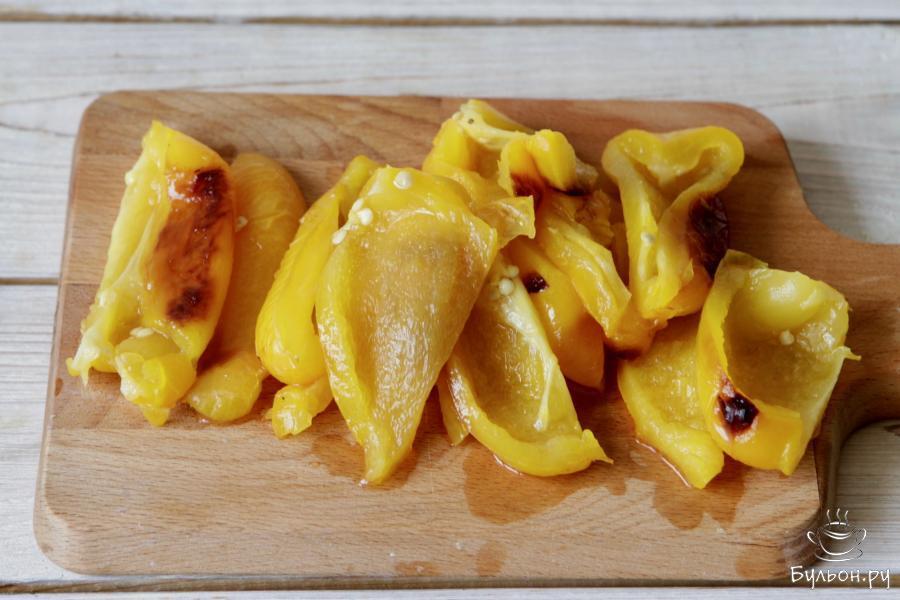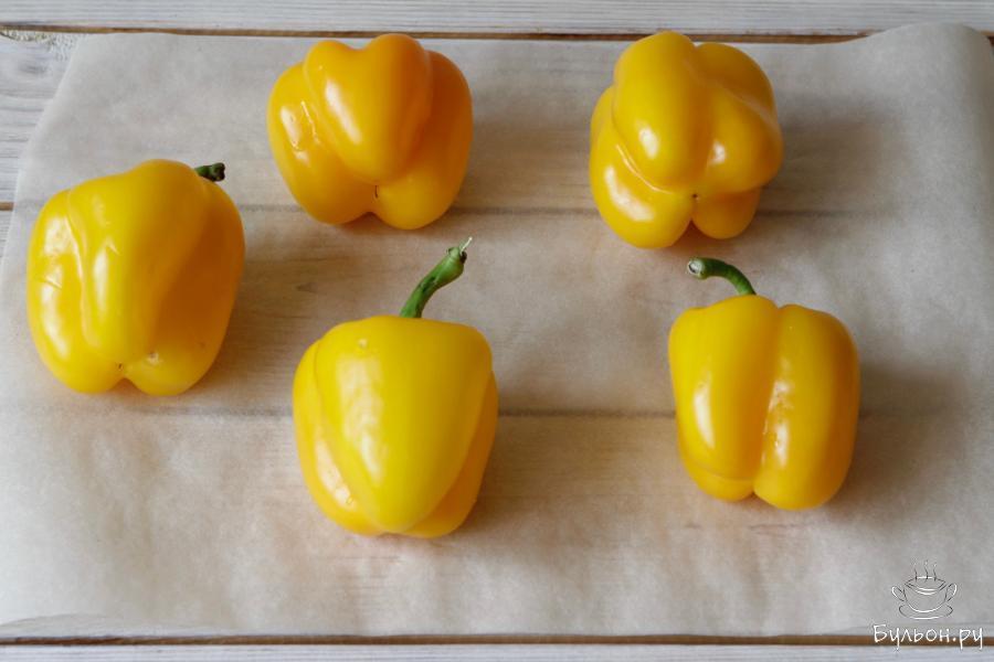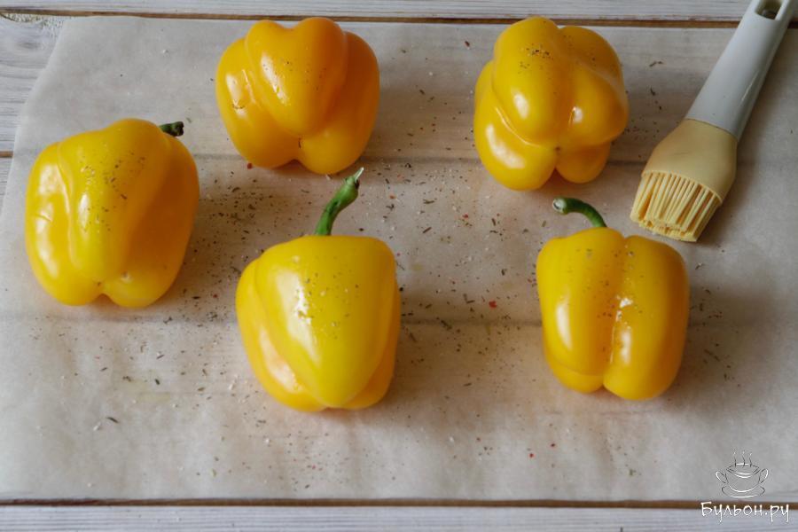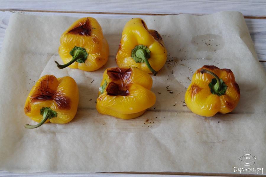 3. Отправить в духовку и запекать 30-40 минут при 200 гр. По готовности перцы достать и переложить в контейнер или целлофановый пакет и дать им немного остыть. Эта процедура облегчит снятия тонкой кожицы с перца.
