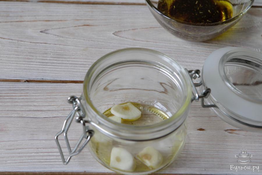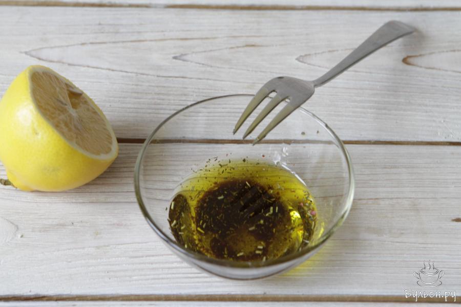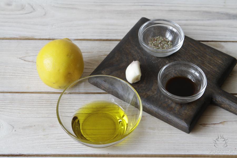 5. Для заправки приготовить оливковое масло, бальзамический уксус, сок лимона, французские травы и зубчик чеснока.