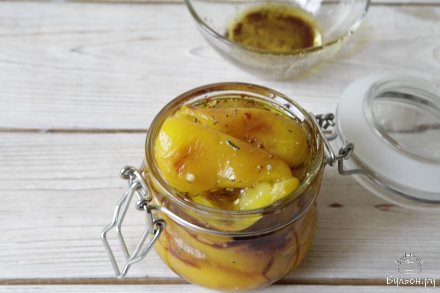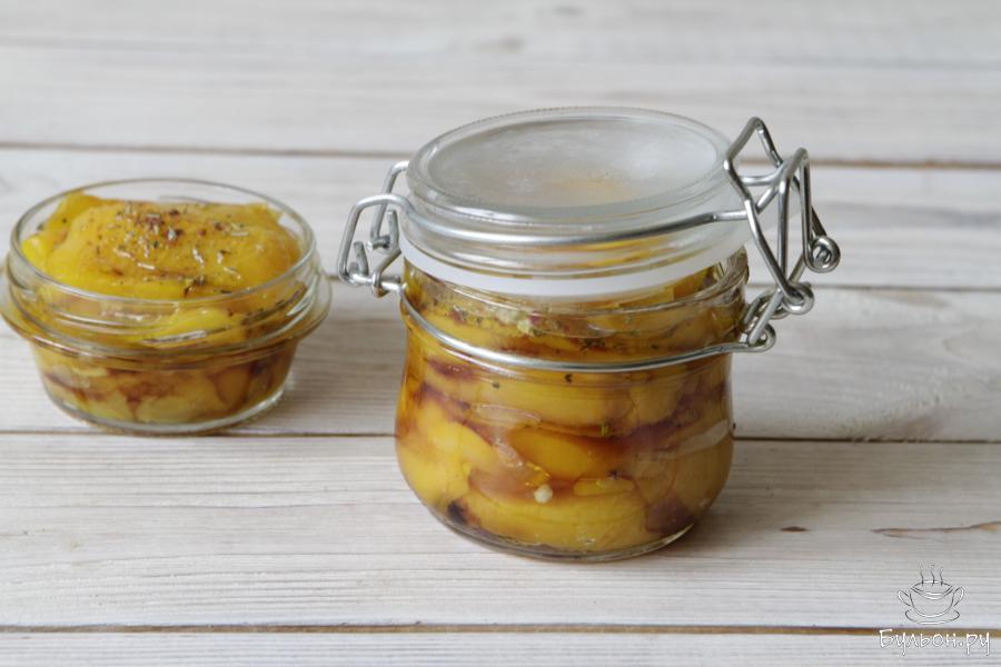 Замечательная и очень простая в приготовлении закуска из желтых перцев вполне украсит любое застолье и будет актуальна во время поста. Вполне неприхотливая в приготовлении, а какая вкусная, про такие блюда говорят "за уши не оттянешь" и это факт. Эту закуску можно подать в качестве канапе для аперитива к горячительным напиткам, зафаршировать небольшие корзинки из слоеного теста и подать к бокалу игристого вина. Одним словом - она универсальная. Хранить ее лучше всего в холодильнике и по готовности не подавать сразу, а дать ей немного настояться.