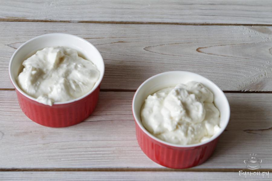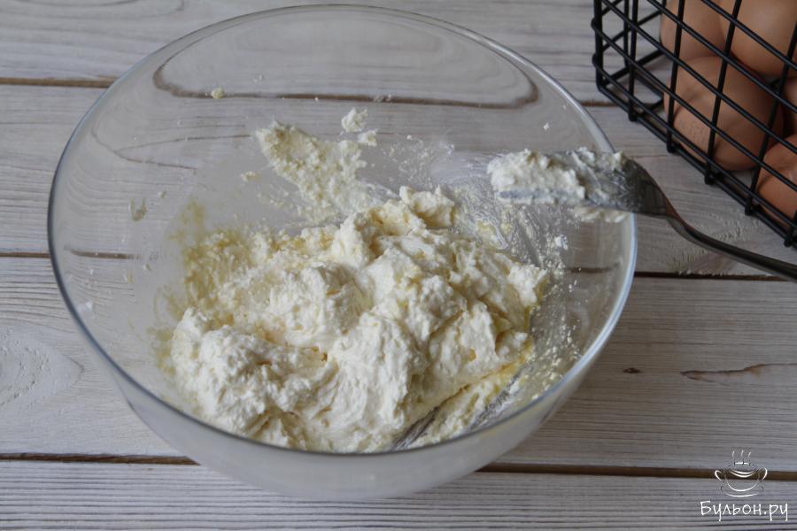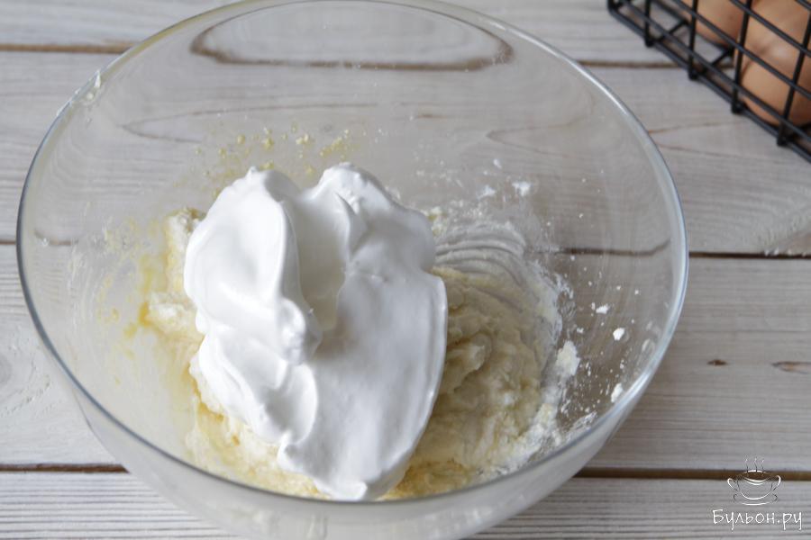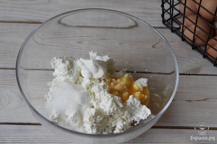 1. Отделить желток от белка. Белок убрать в сторону, желток добавить в чашу с творогом. Всыпать 1 столовую ложку сахара и добавить сметану.