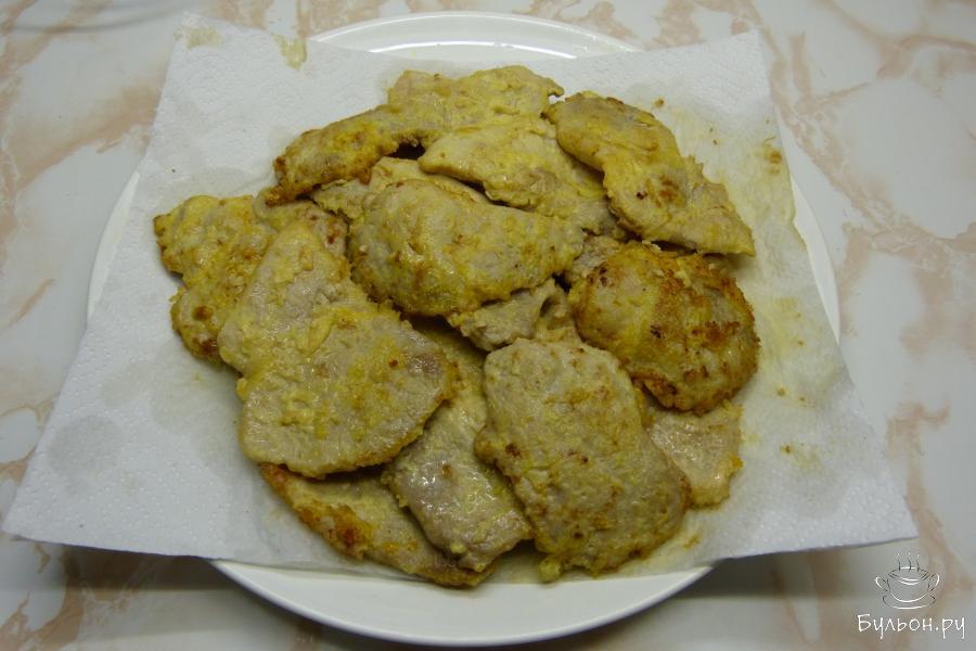 8. Готовые отбивные котлеты выложить на тарелку, покрытую бумажным полотенцем в 2 слоя, чтобы стекало лишнее масло.