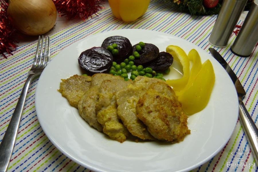 9. Сервировать блюдо отварными овощами (свеклой и зеленым горошком) с добавлением свежего перца. Желаю успехов и приятного аппетита.
