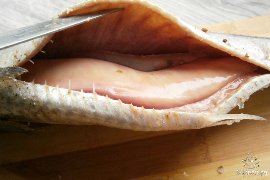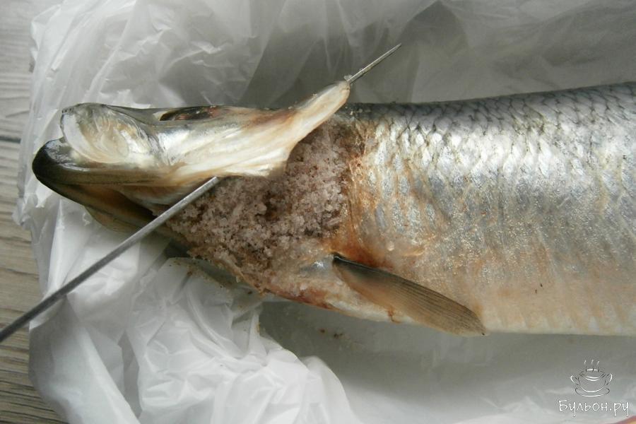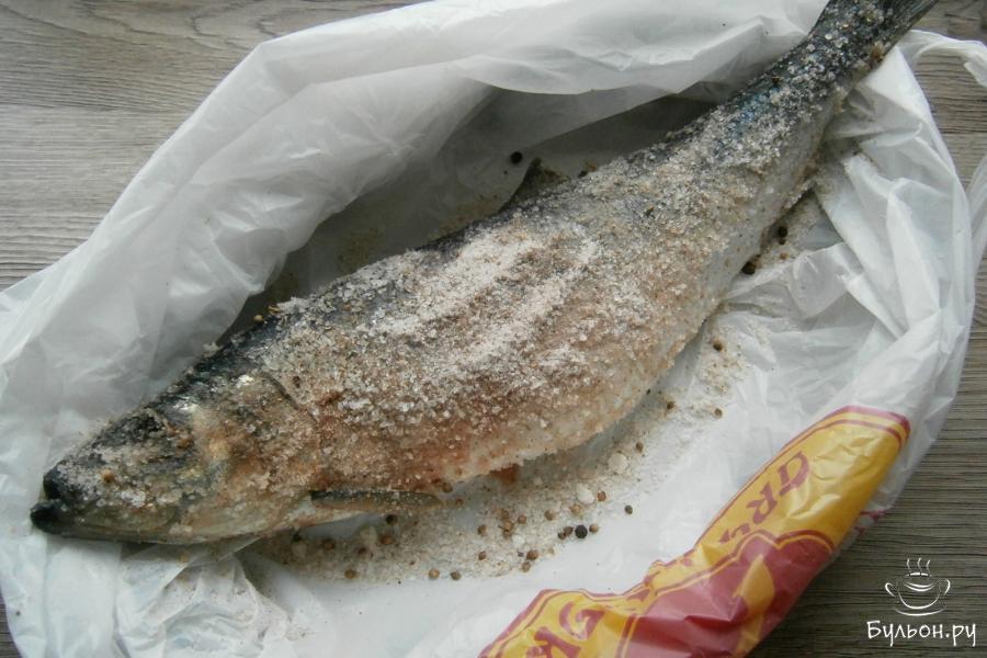 4. Селедку поместить в пакет из целлофана, подходящий по размеру. По столовой ложке соляной смеси насыпать в жабры рыбы.