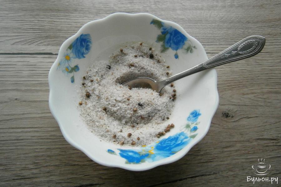 2. К крупной соли добавить черный перец горошком, зерна кориандра, сахар и кориандр молотый, а также, мускатный орех.