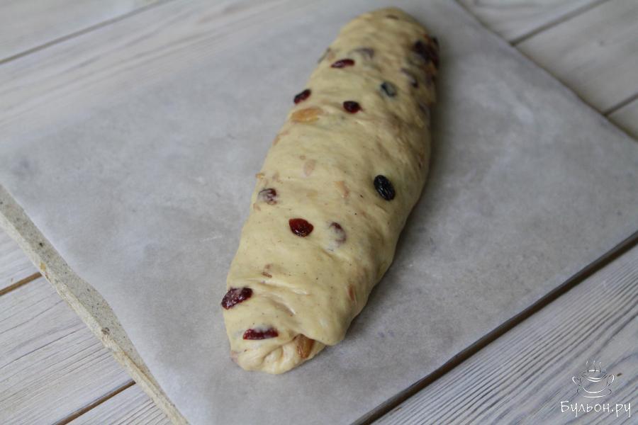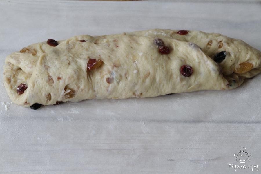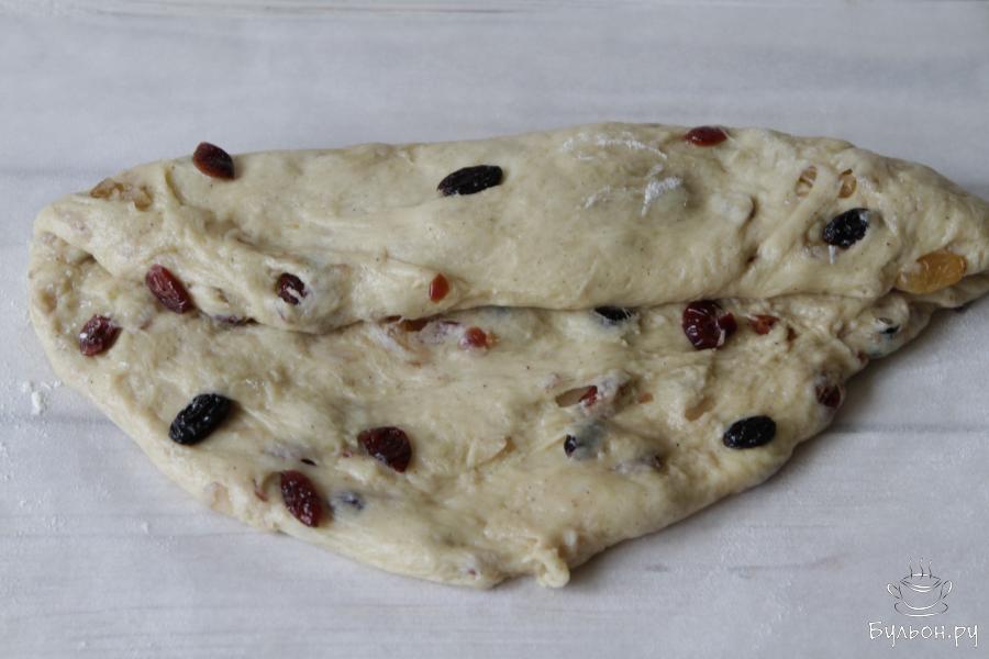 13. Подошедшее тесто обмять и сформировать кекс. Сделать это следующим образом. Раскатать тесто, и сложить его со смещением внахлест.