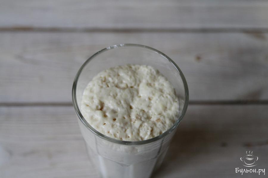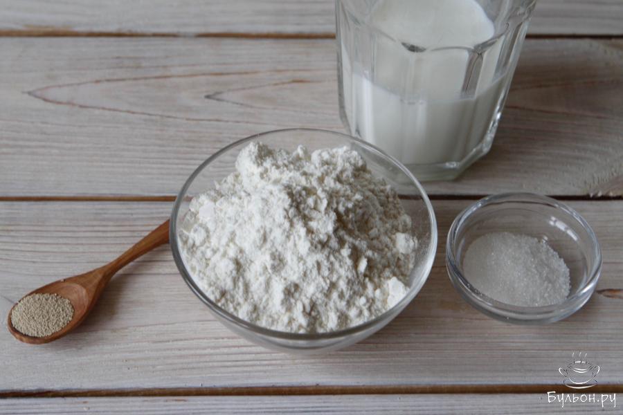 2. Приготовить опару. Подогреть молоко, добавить в него сухие дрожжи, 15 гр сахара и примерно 80 гр муки. Все хорошо размешать и перенести опару в теплое место.