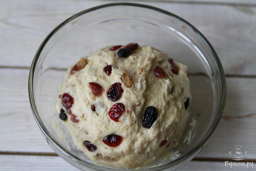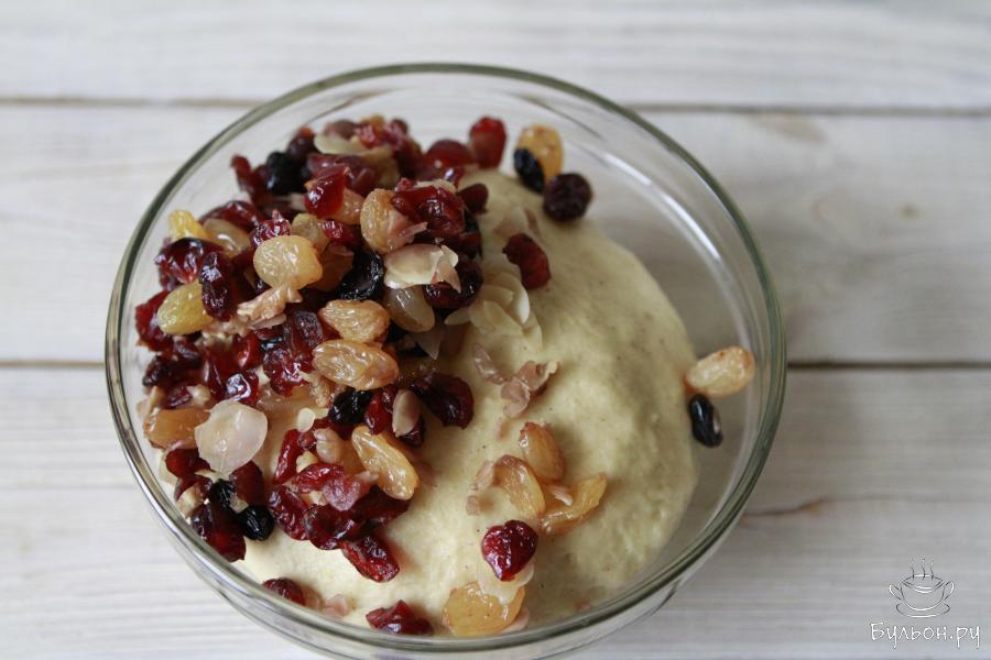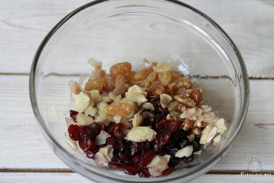 1. С вечера замочить клюкву, изюм, грецкий орех и миндальные лепестки в коньяке. На утро слить коньяк ( его можно использовать для другой выпечки).