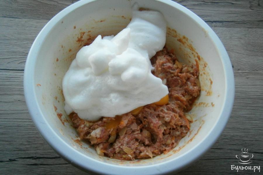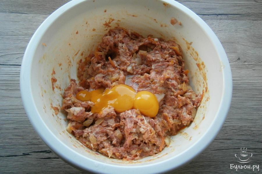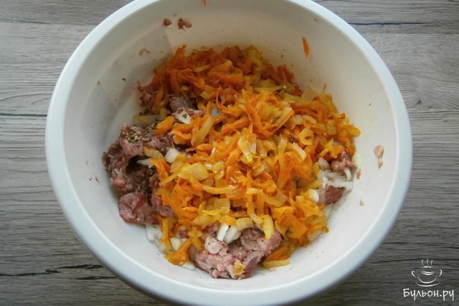 3. Лук порезать небольшими кусочками, морковь - натереть. Обжарить овощи на смеси растительного и сливочного масел до мягкости, затем остудить. Добавить овощи в фарш.